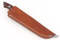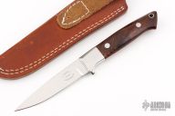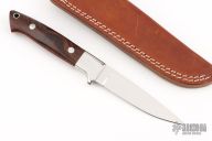 This Hunter by Tim Hartman features a mirror polished blade with .121" blade stock and .806" blade depth, full tapered tang construction. The handle has mirror polished stainless steel bolsters, desert ironwood burl scales with red liners and a lanyard hole. Comes with a brown leather sheath. Excellent condition.