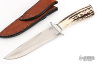 This fighter by Jim Siska features a hand rub satin finished recurve blade with sharpened top edge, .258" blade thickness and 1.442" blade depth, hidden tang construction. The handle has a mirror polished stainless steel guard and butt cap and a beautiful stag grip with black/stainless steel spacers. Comes with original brown leather sheath dated '90. Excellent condition.