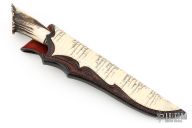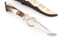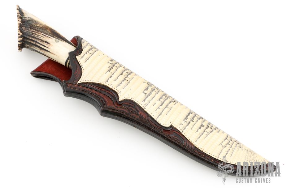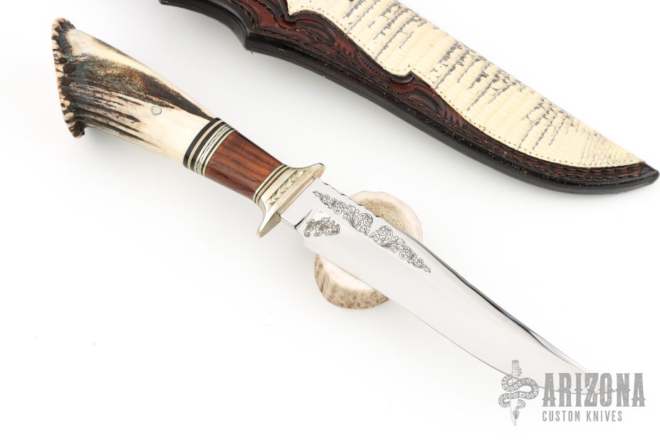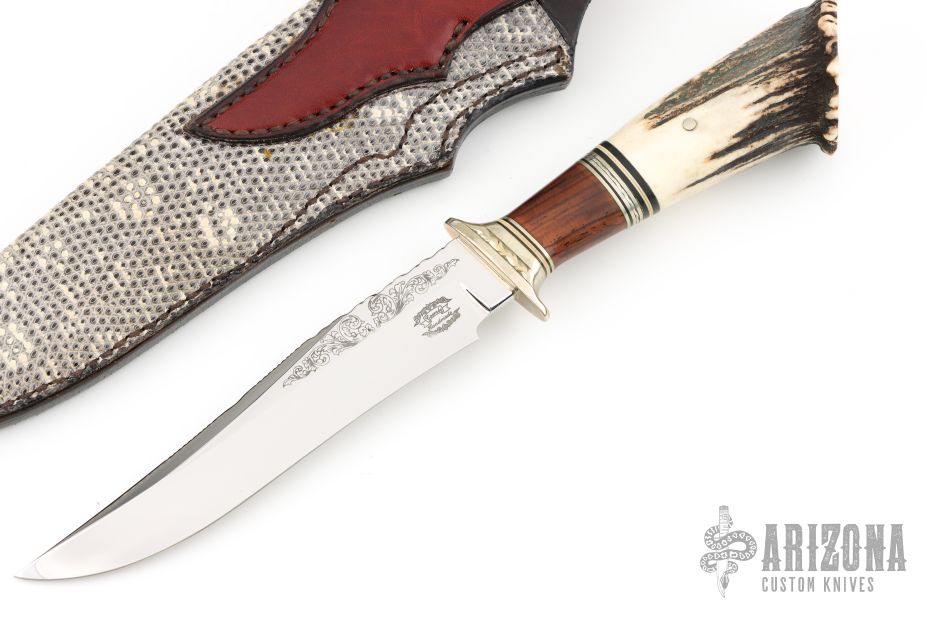 This Custom Hunter by Lamont Coombs Jr features a mirror polished blade with false top edge and fileworked spine, has decorative etchings on the flats, .195" blade stock and 1.140" blade depth, hidden tang construction. The handle has a fileworked nickel silver guard, crown stag and cocobolo grip with black/white/nickel silver spacers. Comes with a hand tooled brown leather sheath with snakeskin inlay. Excellent condition.