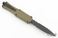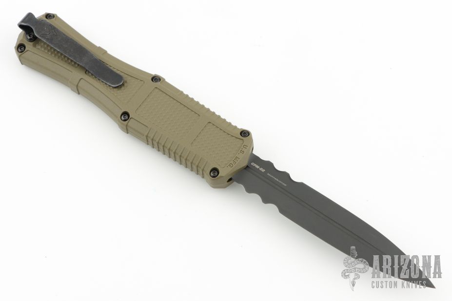 This Claymore OTF from Benchmade features a black coated dagger-style blade with serrations. The handle has a green plastic handle with a black tip down steel clip. Comes with original box, pouch and papers. Excellent condition.