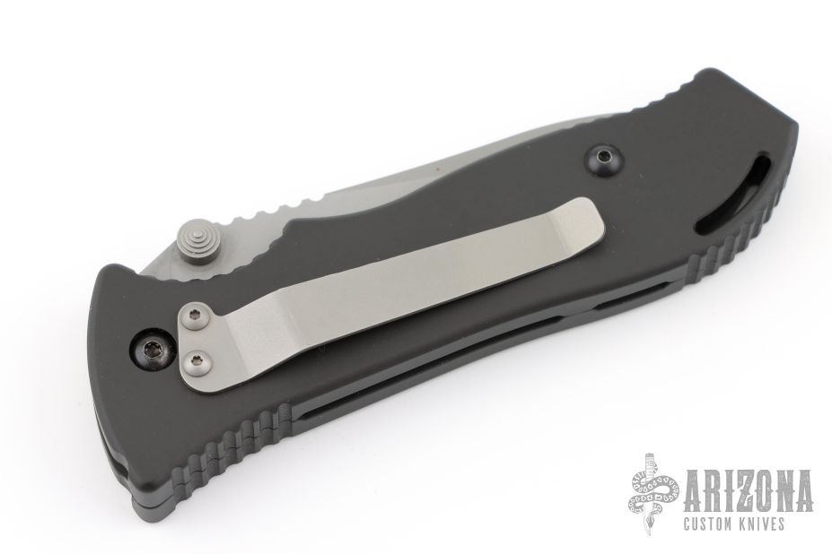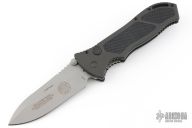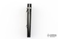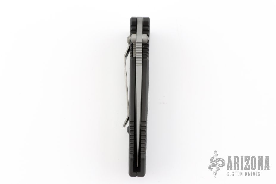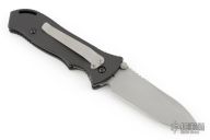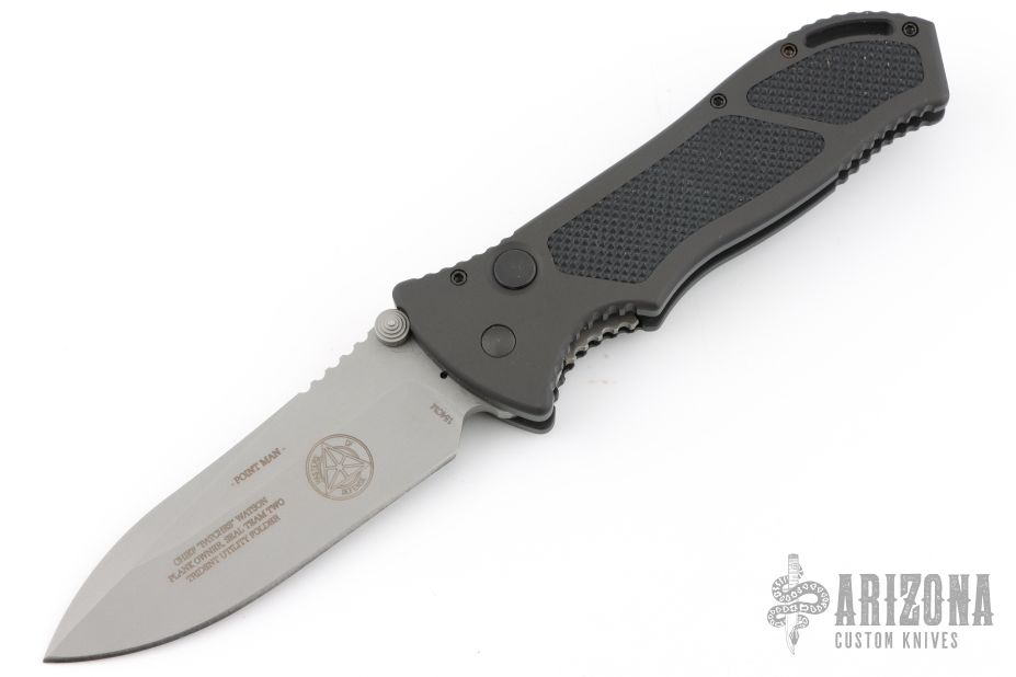 This Trident Utility Folder from Masters of Defense features a bead blasted spear point blade with swedge, notched thumb rest, dual thumb studs. The handle is comprised of black anodized aluminum with non slip inlays on the "A" side over an inlaid steel lockbar. Black coated tip down clip is positioned for right hand carry. Lanyard hole in pommel. Comes with original box and sheath. Excellent condition.