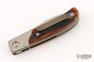This TTF-6 linerlock folder by Bob Terzuola features a tumbled blade with a thumbstud. The handle has a two-tone titanium frame with stag scales, tip up titanium clip. Smooth action. Nice detent, lockup and blade seating. Has been resharpened, has a couple very light scratches, otherwise excellent condition.