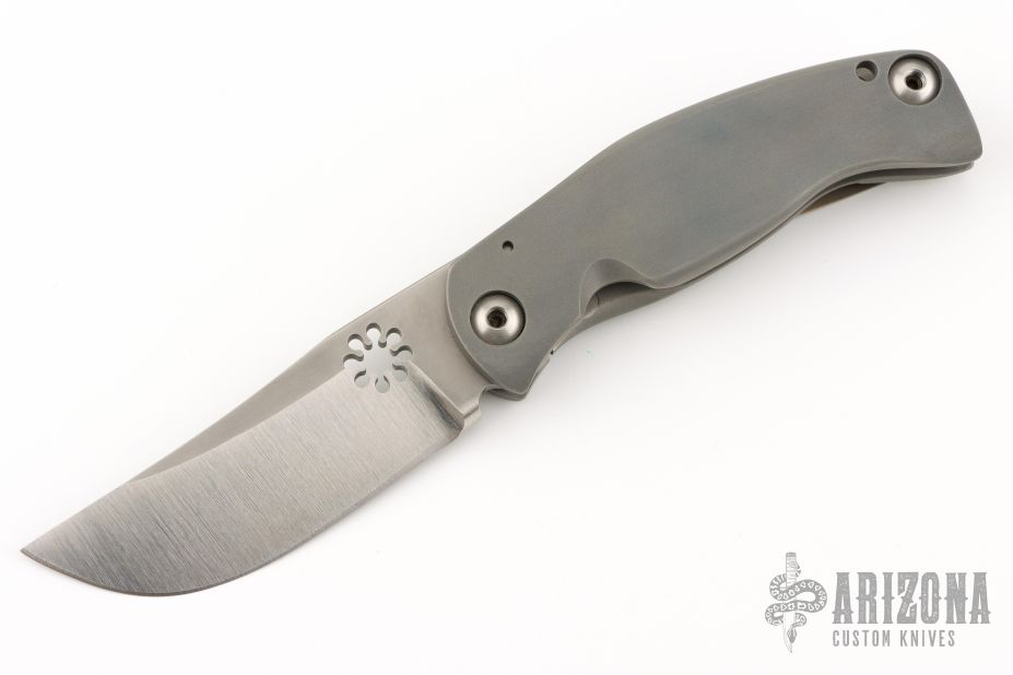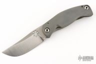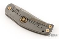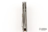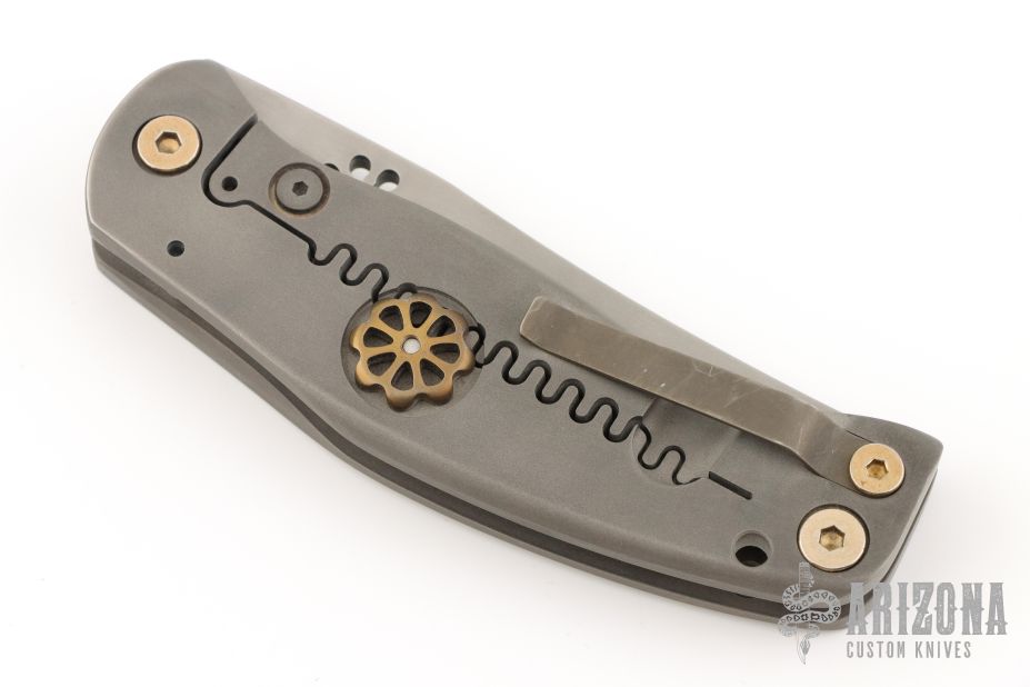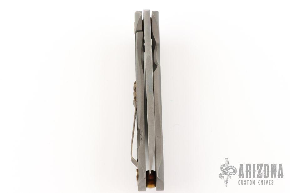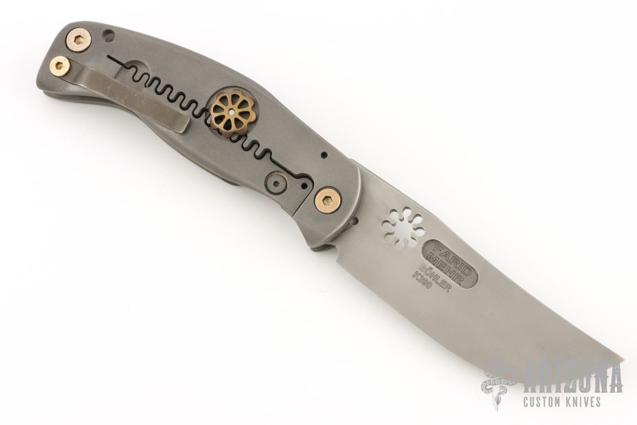This F.M.P. (Farid Mehr Performance) framelock folder by Farid Knives features a satin finished chisel ground K390 steel blade with fuller and thumbhole. The handle has a bead blasted titanium frame with an anodized titanium clip and bronzed hardware. Nice detent, blade seating, and lockup. Has a stainless lockface insert and a titanium barrel spacer. Has some light scuffs, otherwise excellent condition.