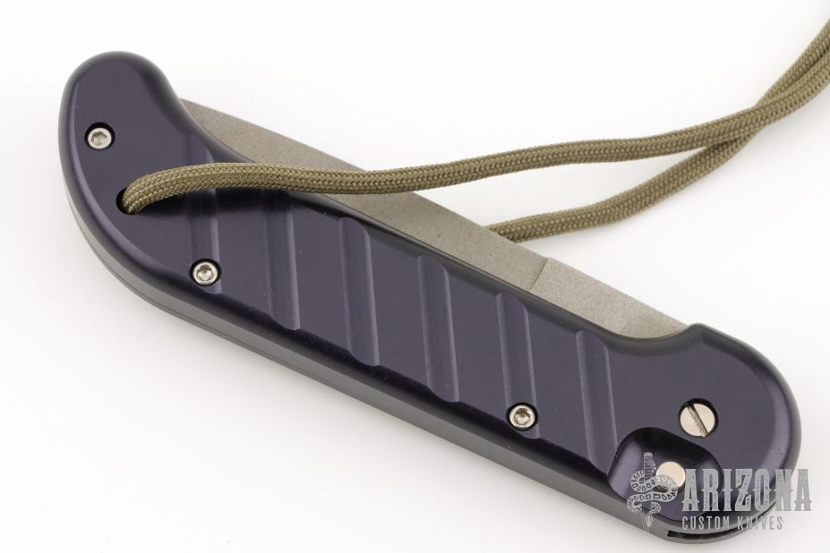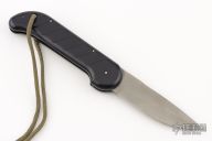 This Black Knife features a spear point bead blasted blade with false top edge. The handle has a black aluminum frame with lanyard hole. Strong action. Excellent condition. Comes with a zippered case.