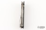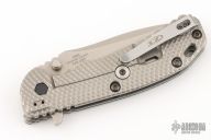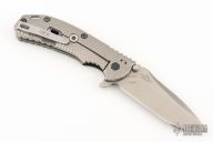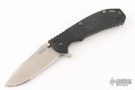 This ZT 0560 Hinderer design has a stonewashed drop point blade with dual thumb studs and notched thumb rest. Handle is black G-10 A-side with titanium B-side. Has 4-way reversible stainless steel clip and lanyard hole.  S/N 6264. Includes the original box and papers. Has been resharpened, otherwise excellent condition.