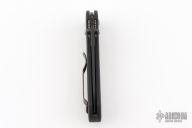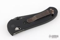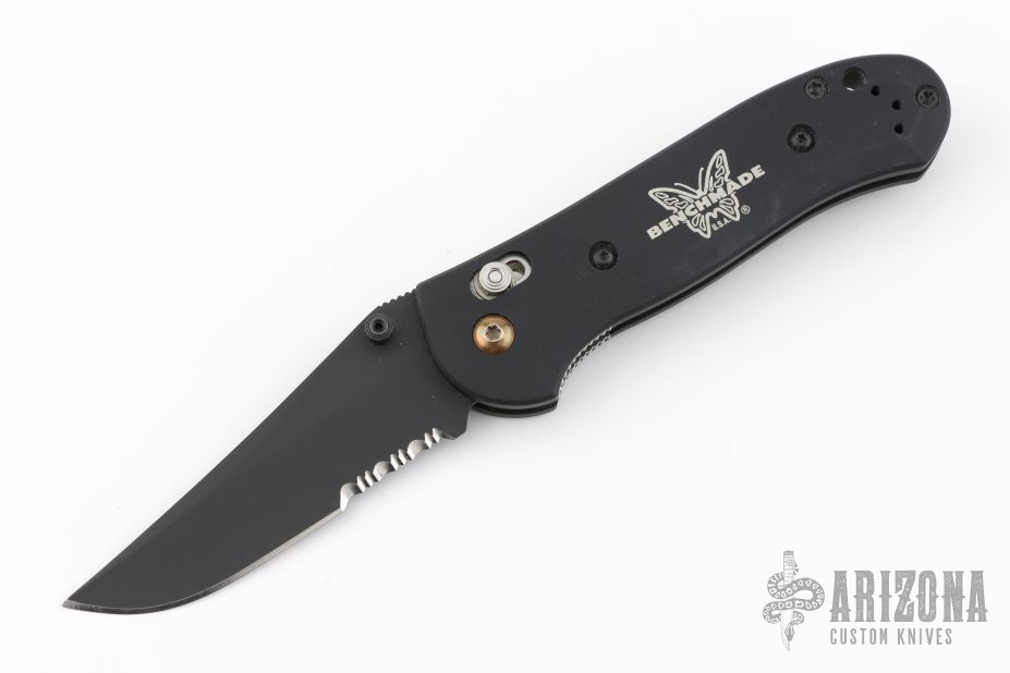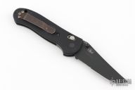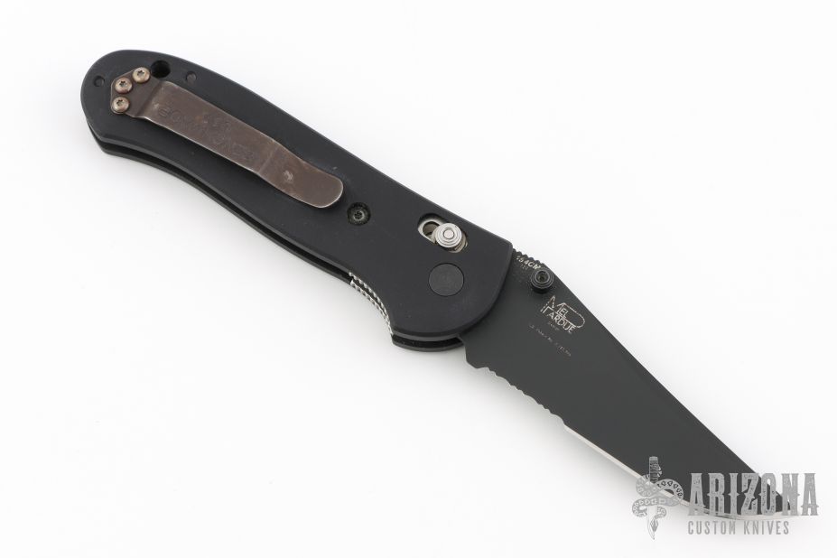 This 720SBT Mel Pardue Axis Lock from Benchmade features a BT2 coated clip point blade with partial serrations, dual thumb studs and notched thumb rest. The handle is comprised of a black anodized aluminum frame over a stainless steel subframe. Black coated tip up/down stainless steel clip. Lanyard hole in pommel. Has some light scuffs, excellent condition otherwise. Comes with a Benchmade box and papers. #720 on the blade.