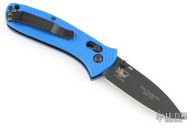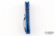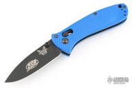 This axis lock by Benchmade features a black coated drop point blade with dual thumb studs and a notched thumb rest. The handle is comprised of textured blue FRN scales over stainless steel sub frame, black coated, stainless steel tip up clip is reversible for right or left hand carry. Includes the original box and papers. Excellent Condition. 1st Production Run #55/100