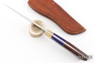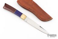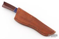 This knife by Gene Martin features a polished drop point blade with swedge, .174" blade stock, .887" blade depth, and full tang construction. The handle features dovetail brass bolsters, stone, and wood grip. Comes with a leather belt sheath. Has some scuffs, scratches, and patina. Great condition otherwise.