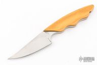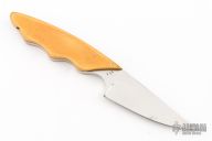 This knife by Rick Hill features a mirror polish finished blade with .195" blade stock and 1.237" blade depth, full tang construction. The handle has vintage paper micarta covers with nickel silver pins. Lanyard bail in pommel. Comes with a zipper case. Has some light scratches, otherwise excellent condition.