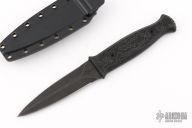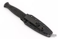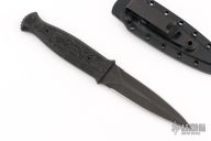 This knife features a black acid tumbled double-edged blade with a full tang construction .147" blade stock and .940" blade depth. The handle has G-10 scales. Comes with a kydex sheath with clip and a hat. Excellent Condition.