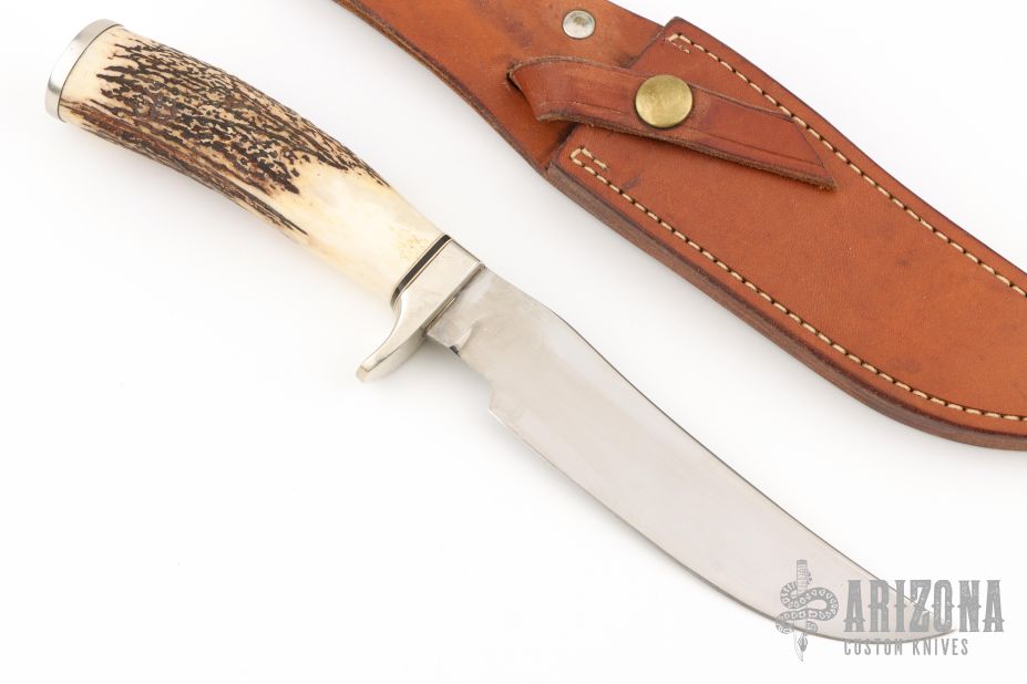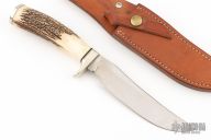This knife by Chubby Hueske features a mirror finished blade with .192" blade stock and 1.250" blade depth, hidden tang construction. The handle has nickel silver guard and butt with a stag grip that has black and white spacers. Comes with a brown leather sheath. Excellent condition.