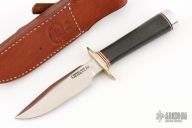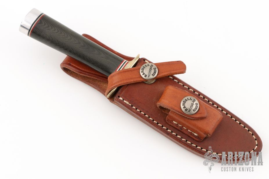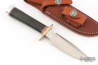 This is a miniature Model 1 - with all the features of the famous WWII full size Model 1. Stainless steel blade with top edge sharpened approximately 1 3/4 inches back from the tip, .173" blade stock and .818" blade depth, hidden tang construction. The handle has a nickel silver double guard, duralumin butt, and a black linen micarta grip with red/white/blue spacers. Comes with a brown leather sheath. In addition, the knife is authenticated by a coded transponder which cannot be altered. The transponder is inserted into the handle during construction with an encoded serial number matching the etched number on the blade. Only 1500 made. Serial number 289. Excellent condition.
