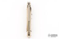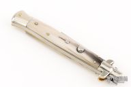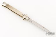 This Bayonet ground auto from Latama features a spear point mirror polished blade with false top edge and flat ground bevels. The handle is comprised of nickel silver bolsters and buffalo horn scales over brass liners, nickel silver butt. Nice action, lockup and blade seating. Comes with original box and oiler. New condition.