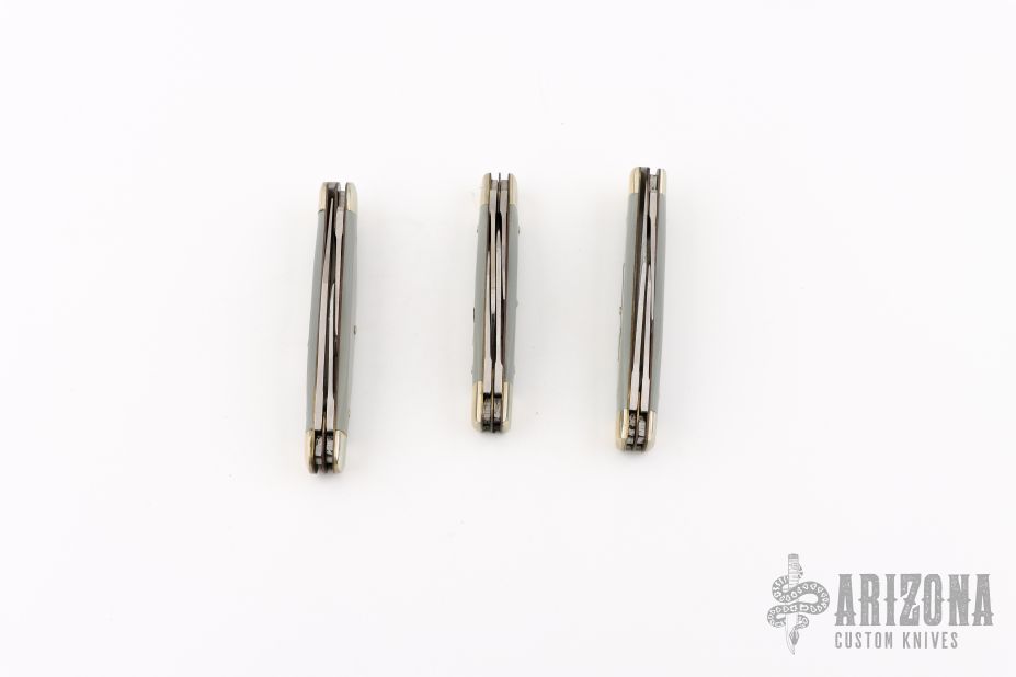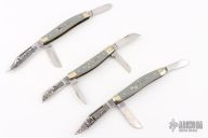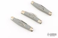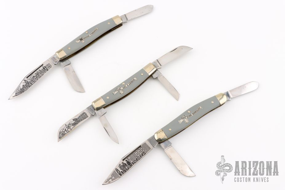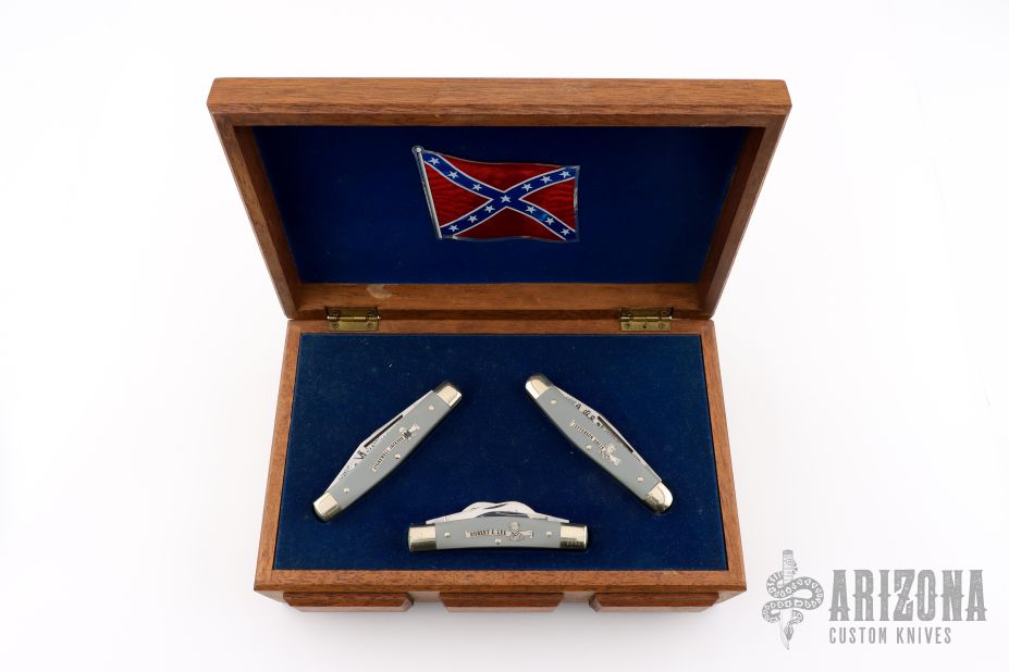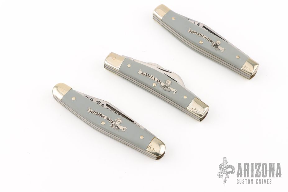 This set is 3 Slipjoints by Boker. Mirror polished blades, nickel silver bolsters, gray covers, brass liners, stainless steel springs. Jefferson Davis, Stonewall Jackson, Robert E. Lee. Comes in a felt-lined, wooden display box, also a wind-up music box. Excellent condition.