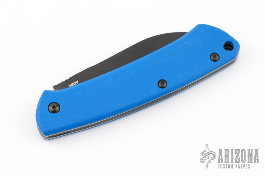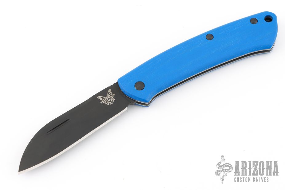 This Benchmade Proper slip joint folder is a modern take on a classic gentleman's knife design. This model features blue g10 covers paired with a DLC sheepsfoot blade made from premium S30V stainless steel. Skeletonized stainless steel liners offer reduced weight for comfortable everyday carry in a pocket or pack. A lanyard hole in the handle accommodates key ring or lanyard attachment. Comes with original box and papers. Excellent condition.