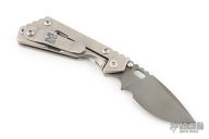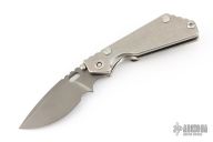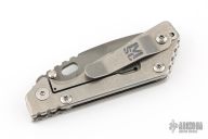 This PT framelock folder by Mick Strider features a black wide belly blade with notched thumbrest and a thumbhole. The handle has a tumble finished titanium frame with matching tip up titanium clip. Nice detent, lockup and blade seating. Comes in a zipper case. Has a couple light scuffs, excellent condition otherwise.