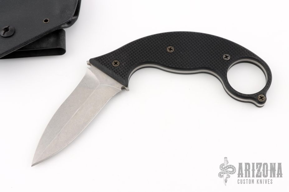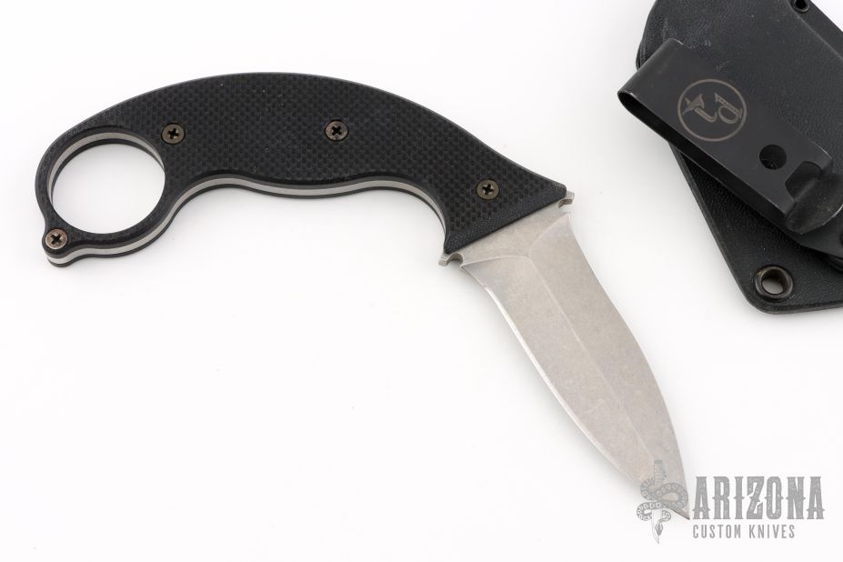 This Punch Badger by Tracker Dan features a stonewashed dagger blade with false top edge, .119" blade stock and 1.215" blade depth, full tang construction with black G-10 scales. Has an ambidextrous kydex sheath with belt clip. Excellent condition.