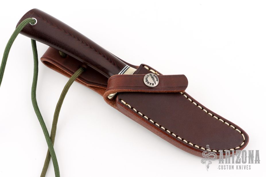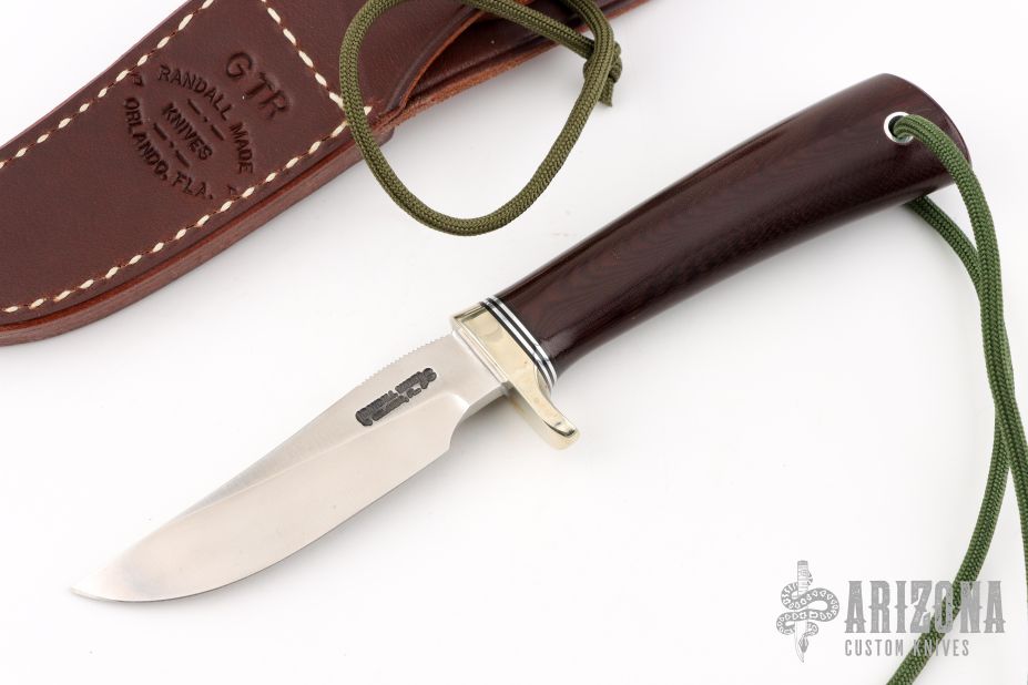 This GTR Special by Randall Made Knives features a satin finished blade with notched thumbrest, .166" blade stock and .879" blade depth, hidden tang construction. The handle has a nickel silver guard, black linen micarta grip and black/duralumin spacers, lanyard hole at the butt. Knife comes with a brown leather sheath with belt loop. New from maker.