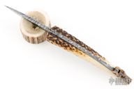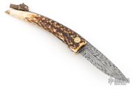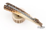 This linerlock folder by Master Smith David Lisch features a Feather Pattern Damascus blade (15n20/1080, 59-61Rc). The handle has integral construction, with a channel in the stag, forged inlaid lockbar, hand riveted Damascus backstrap, with a hand forged silicone bronze wolf head at the pommel. Stippled brass pivot surround. Opens and locks with a very satisfying snap, two-hand opening. Incredible piece, with MS stamp on the spine.