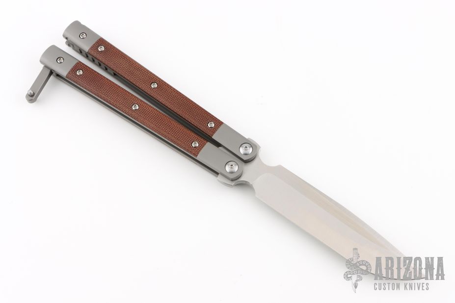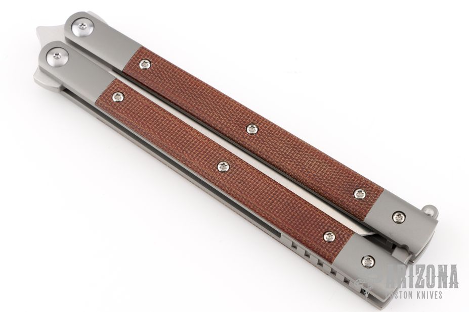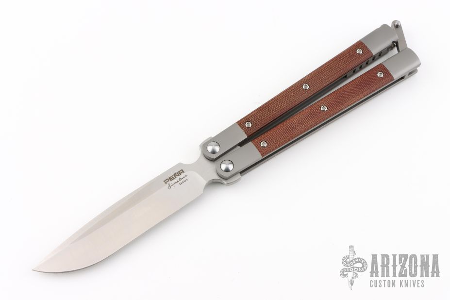 This model of the Pena Signature Series Mid-Tech Penasong comes with a blasted titanium handle with natural canvas micarta inlays and a satin finished drop point blade made from CPM-154. The Mid-Tech Penasong from Enrique Pena is a more accessible version of his custom Penasong, but doesn't sacrifice any of the quality. Each knife is assembled and hand ground by Enrique. The body screws, latch, and spacers are made out of titanium, while the pivot pins are made from stainless steel. Ceramic ball-bearings allow the knife to flip with ease and run on stainless washers to prevent wear on the titanium frame. Upgrade your balisong game and pick up one of these fine Mid-Tech Penasong knives. Comes with a Maker's zippered case. Excellent condition.
