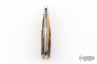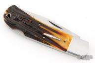 This lockback by Luke Swenson features a hand rub satin finished clip point blade with nail nick and notched thumbrest. The handle is comprised of stainless steel bolsters, stag covers, stainless steel bullet escutcheon, stainless steel liners and a stainless steel lockbar with crosshatch pattern on the lock relief. Comes with zippered case. New from maker at the 2025 Blade Show Texas.