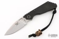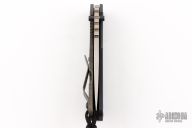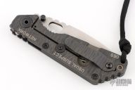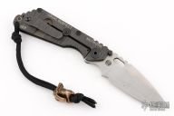 This SNG by Strider is a collaboration with Starlingear and the USN, it features a stonewashed blade with notched thumbrest and thumbhole. The handle has a black G-10 and flamed titanium frame with matching tip up clip. "USUAL SUSPECT NETWORK" and "069" on the handle. Has an antiqued copper Slickster Grenade bead with Strider Logo. Nice detent, lockup and blade seating.