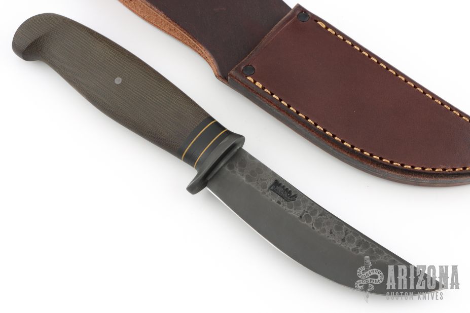 This Hunter by Rocco Handmade features a black finished convex ground blade with hammer marked flats, .181" blade stock and 1.121" blade depth, hidden tang construction. The handle features a black stainless guard, black/yellow spacer pattern, and OD micarta handle. Great look and feel. Comes with black leather sheath. New from maker at the 2025 Blade Show Texas!