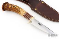 This Scagel Style Trout by Rocco Handmade features a satin finished convex ground blade with .104" blade stock and .903" blade depth, hidden tang construction. The handle features a brass guard, red/brass/leather spacers, and a crown stag grip with brass pins. Great look and feel. Comes with a Treeman brown leather sheath. New from maker at the 2025 Texas Blade Show!