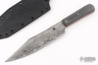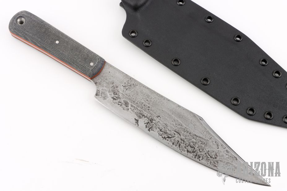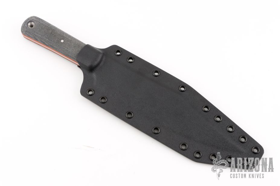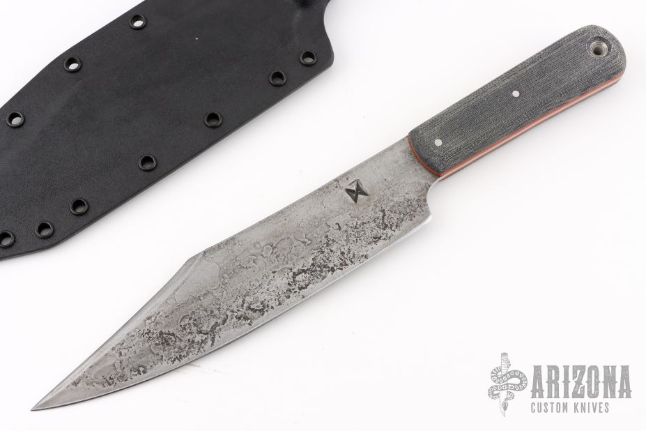 This knife by James Helm features a hand forged blade, .136" blade stock and 1.783" blade depth, full tang construction. The handle has terotuf slabs, with orange G10 liners, stainless pins and lanyard hole. Comes with a Boltaron sheath. New from Maker at Blade Show Texas 2025!