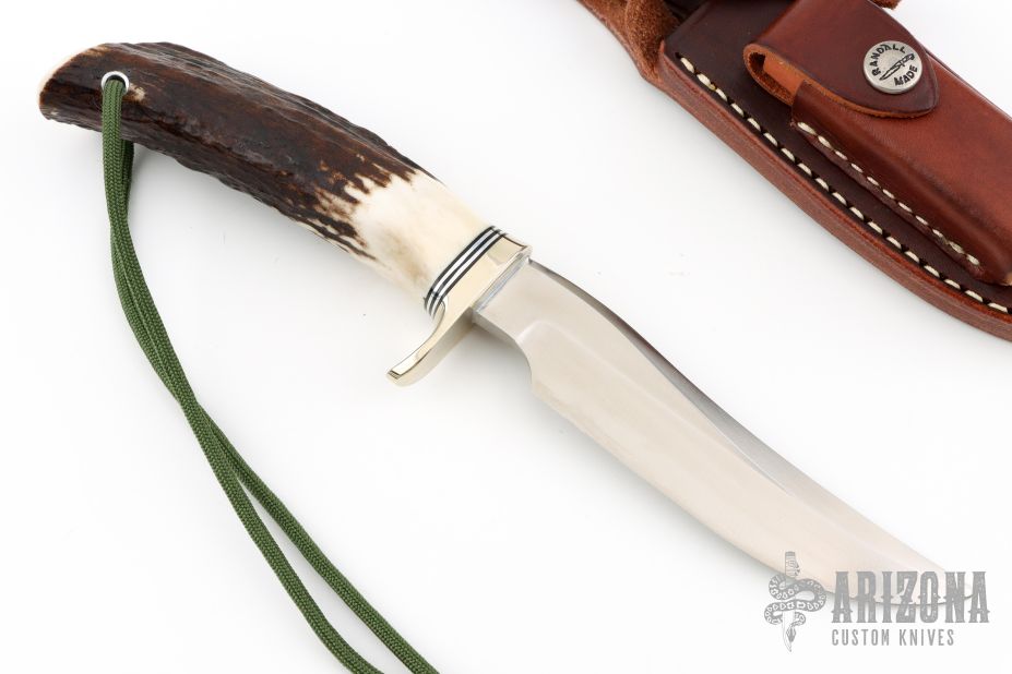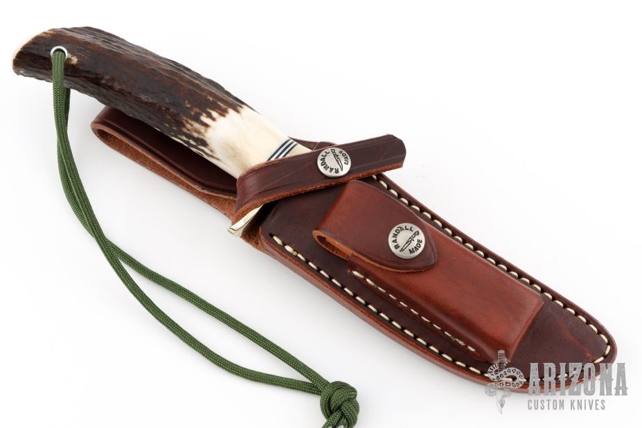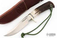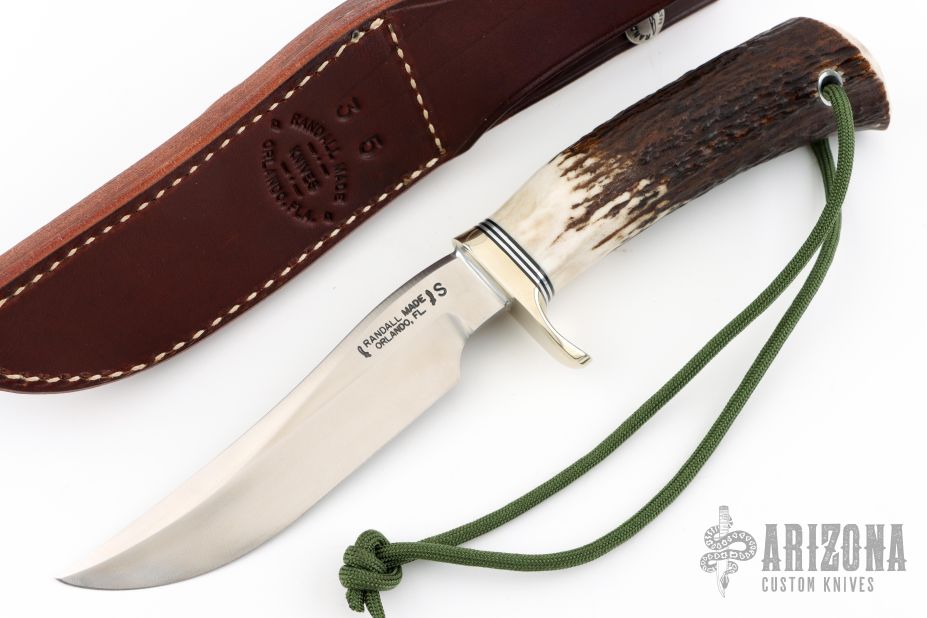 This Model 3-5 by Randall Made Knives features a satin finished blade with false top edge, .215" blade stock and 1.113" blade depth, hidden tang construction. The handle has a nickel silver guard, stag grip with black and duralumin spacers, lanyard hole. Comes with a brown leather sheath and sharpening stone. Excellent condition.