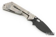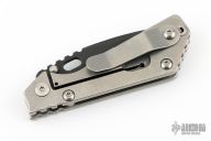 This PT by Mick Strider features a black blade with notched thumbrest and thumbhole. The handle has a stonewash titanium frame with matching tip up clip. Excellent condition.
