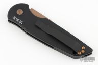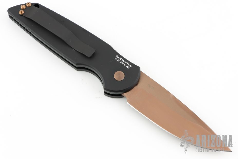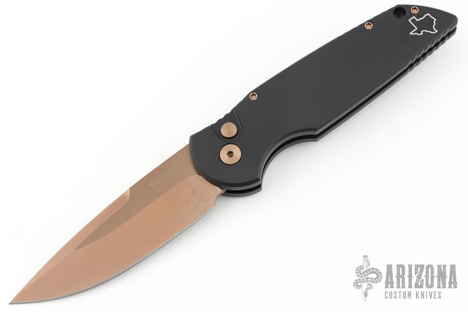 This TR-3 by Pro-Tech Knives features a black handle with a rose gold push button and hardware. Item includes a rose gold finished blade and a black tip up stainless steel clip. The TR-3 is a responsive automatic knife that won't let you down. It fires hard, locks up like a rock, and feels great in hand. The slim design sits comfortably for tip-up pocket carry. Comes with original box and papers. New from maker!