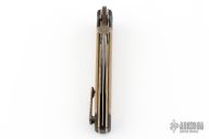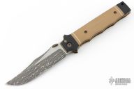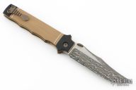 This MAC V SOG folder by Allen Elishewitz features a stainless Damascus blade with notched thumbrest and thumbdisc. The handle has G-10 scales, textured and anodized titanium liners, black G-10 backspacer, tip up anodized titanium clip. Nice detent, lockup and blade seating. New from maker.