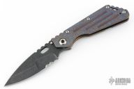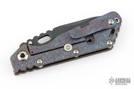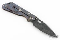This SMF by Mick Strider features a nightmare ground partially serrated blade with a notched thumbrest and thumbhole and magma textured flats. The handle has a magma textured and anodized titanium frame with matching tip up clip. Excellent condition.