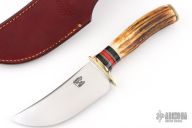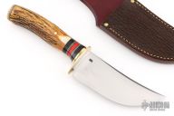 This Hunter by Jim Behring features a satin finished and convex ground blade with a false top edge, .206" blade thickness and 1.716" blade depth, hidden tang construction. The handle has a brass guard, pinned Sambar stag grip, black/red/brass spacer pattern, and musk ox cap. Great look and feel. Comes with brown leather sheath with premium sharkskin panel. New from maker at the 2025 Blade Show Texas!