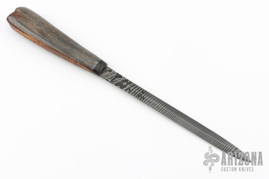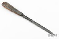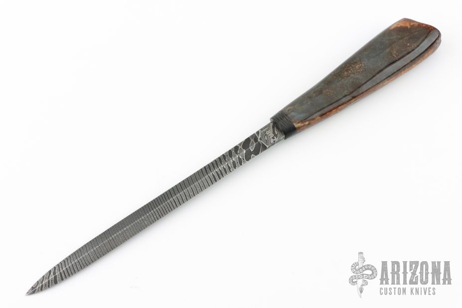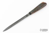 This Dagger Letter Opener by Curt Zimmermann features a Mosaic Damascus double edged blade with .119" blade stock and .477" blade depth, hidden tang construction. The handle has a carbon fiber, fossil walrus ivory grip. Excellent condition.