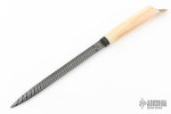This Dagger Letter Opener by Curt Zimmermann features a Mosaic Damascus double edged blade with .136" blade stock and .520" blade depth, hidden tang construction. The handle has a carbon fiber, fossil walrus ivory grip. Excellent condition.