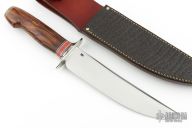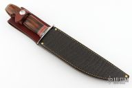 This Fighter by Jim Behring features a satin finished convex ground blade with 0.223" blade stock and 1.574" blade depth, hidden tang construction. The handle has a nickel silver guard, AAA Ironwood grip, with blue/white/red spacers and crow's beak butt with musk ox cap. Comes with a brown leather sheath with premium shark panel. New from maker at the 2025 Blade Show Texas!