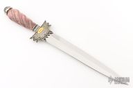 This dagger by Jim Ence features a mirror polished double edged blade with .200" blade stock and 1.152" blade depth, hidden tang construction. The handle has an engraved nickel silver guard with gold inlays, spiral fluted stone grip with gold chain inlays, engraved nickel silver collar and butt cap. Comes with a zippered case. Excellent condition.