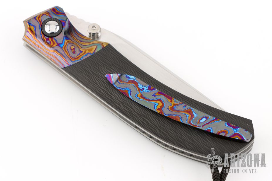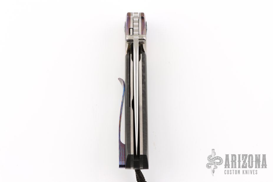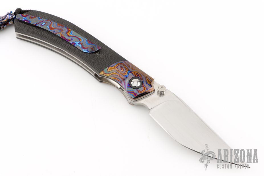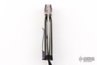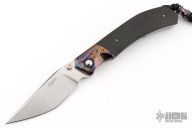 This Linerlock by Stephane Sagric features a hand rub satin finish Tanto blade with dual thumbstuds and notched thumbramp. The handle has polished Zircuti bolsters, side cut carbon fiber scales with titanium liners, carbon fiber pivot surrounds, notched backbar and Zircuti tip up clip. Rides on bearings, nice detent, lockup and blade seating. Comes with leather case and coin. New from Maker at the Texas Blade Show 2025!