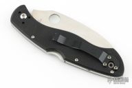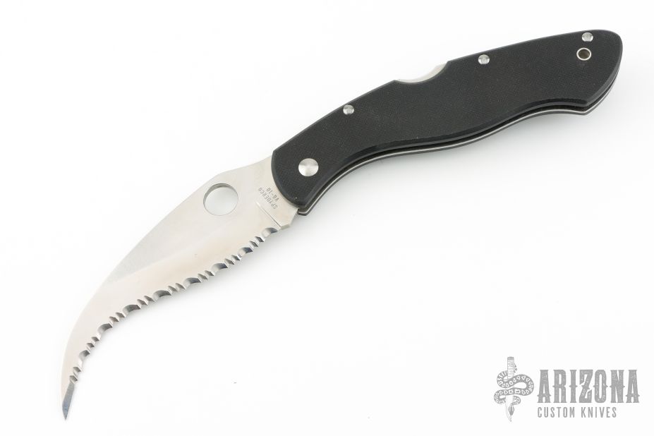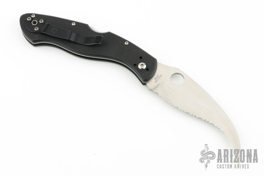 This Civilian Lockback Folder by Spyderco has a satin finished, fully serrated hawkbill blade with thumb hole. Handle is black G-10 with stainless steel (single) liner, stainless steel backspacer/ lock, and tip up/ down 2-way reversible RH black stainless steel clip. Excellent Condition.  Comes with a Spyderco zippered case and original papers.