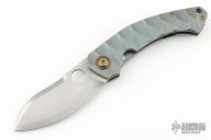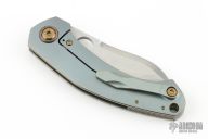 This particular version is made with a Takefu Ghost SanMai Blade, Cuprum Anodized Frame & Clip, Black Timascus Spacer, Timascus Pivot Rings and Amber Anodized Titanium Screws.