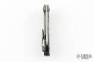 This Zero by Jens Anso features a Takefu Ghost San Mai Damascus blade with thumbhole and false top edge. The handle has an Anso textured and fine checker milled anodized titanium frame, anodized titanium tip up clip, Black Timascus backspacer with milling, lanyard hole, anodized titanium hardware and timascus pivot collars. Nice detent, lockup and blade seating. Rides on bronze washers. Comes with original box and COA dated Feb 15, 2025. New condition.