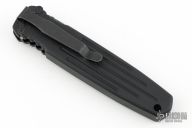 This Mini Covert Auto by Gerber features a black spear-point partially serrated blade and a notched thumbrest. Has a black aluminum handle with a and safety. Black stainless steel clip, tip down clip. Comes with original box and papers. The box is a little beat up, otherwise excellent condition.