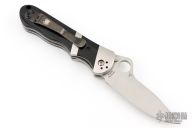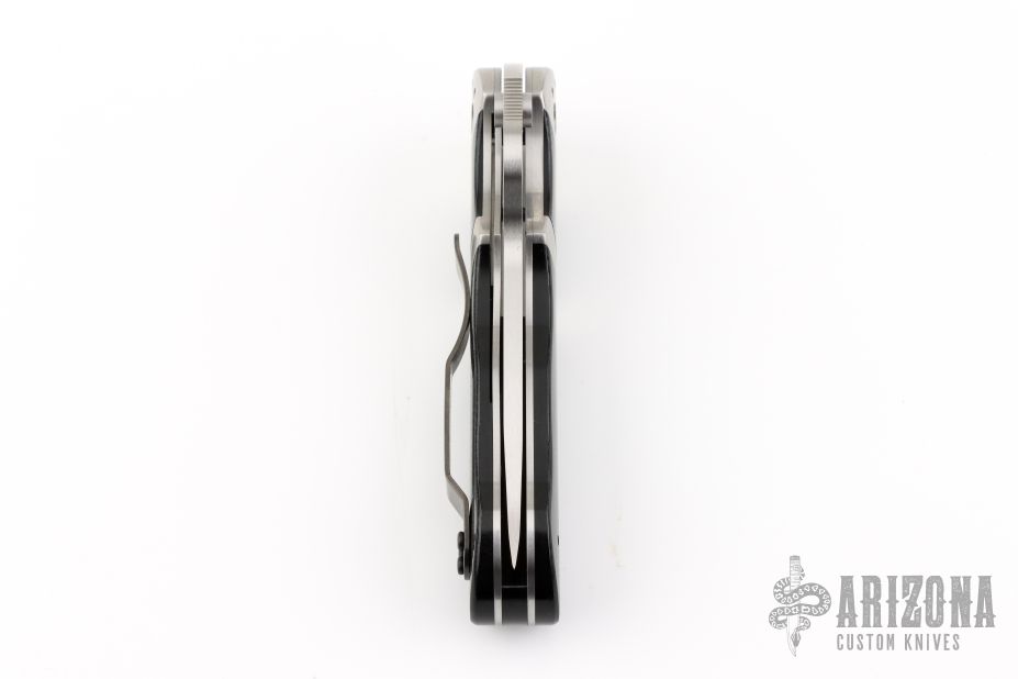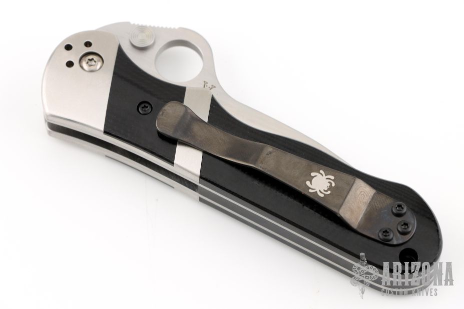 This Sub-Hilt by Spyderco features a satin finished blade with a thumb-hole, dual thumb-studs, and notched thumbrest. The handle has titanium bolsters, black G-10 scales, stainless steel liners, black G-10 backspacer, and 4-way reversible deep carry clip. Nice detent, lockup and blade seating. Comes with original box and papers. Excellent condition .