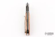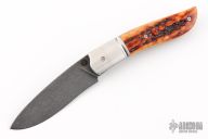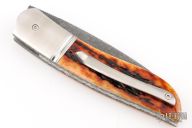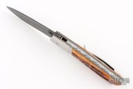 This Front Flipper Linerlock Folder by Tim Bernard features an acid washed drop point blade. The handle has satin finished fluted titanium bolsters, jigged bone covers, textured and acid washed stainless steel liners, very nice file work on the backspacer. Nice detent, lockup and blade seating. Comes with a leather slip sheath and COA. New from maker at the 2025 Blade Show Texas!