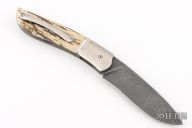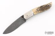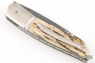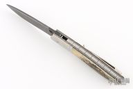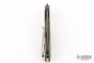 This Front Flipper Linerlock Folder by Tim Bernard features an acid washed drop point blade. The handle has satin finished fluted titanium bolsters, mammoth covers, textured and acid washed stainless steel liners, and notched backspacer. Nice detent, lockup and blade seating. Comes with a leather slip sheath and COA. New from maker at the 2025 Blade Show Texas!