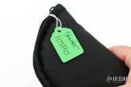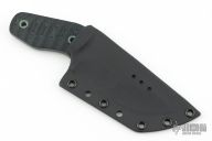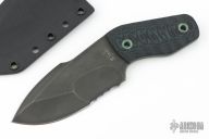 This SJ75 Fixed Blade by Mick Strider features a black nightmare ground partially serrated blade with sharpened top edge, .190" blade stock and 1.926" blade depth, full tang construction with black/grey G-10 scales. Comes with a kydex sheath and zippered case. Has a few light sheath marks, otherwise excellent condition.