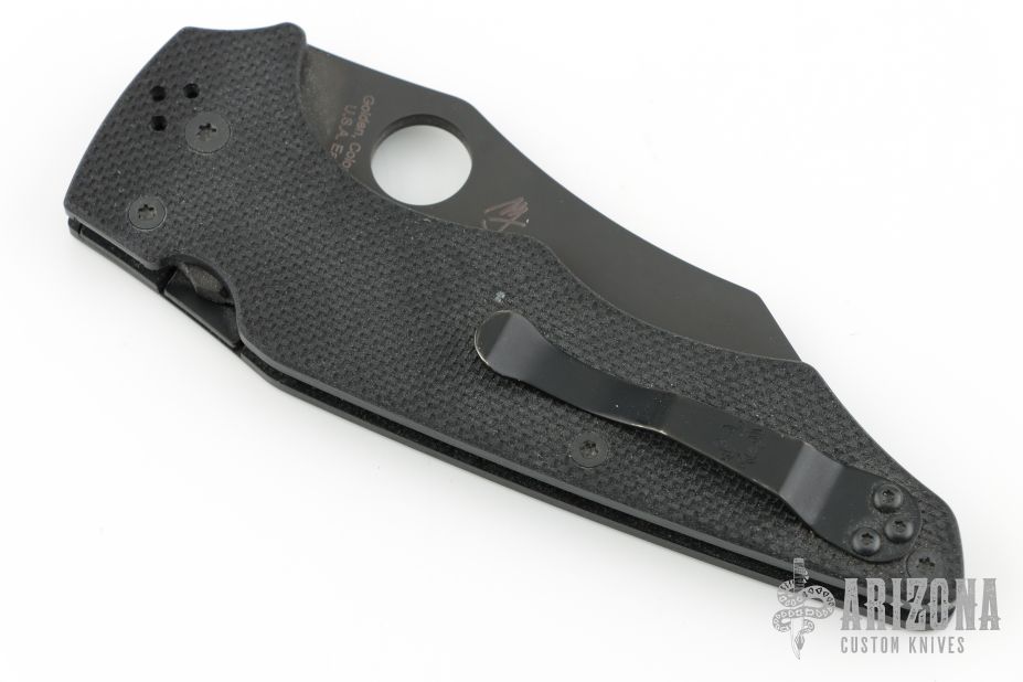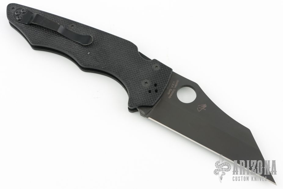 This Yojumbo by Spyderco features a black finished wharncliffe blade with thumbhole. The handle has a black G-10 frame with stainless steel liners, lock is on the spine of handle. 4-way reversible stainless steel clip. Nice detent, lockup and blade seating. Comes with original box and papers. Excellent condition.