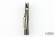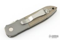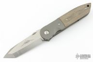 This Custom CQC-6 by Emerson features a chisel ground tanto blade with a satin finish, thumbdisc and notched thumbrest. The handle has bead blasted titanium dovetailed bolsters and titanium liners, green canvas micarta scales, black G-10 backspacer, and a tip up stainless steel clip. Nice detent, lockup and blade seating. Comes with original box and papers. Excellent condition.